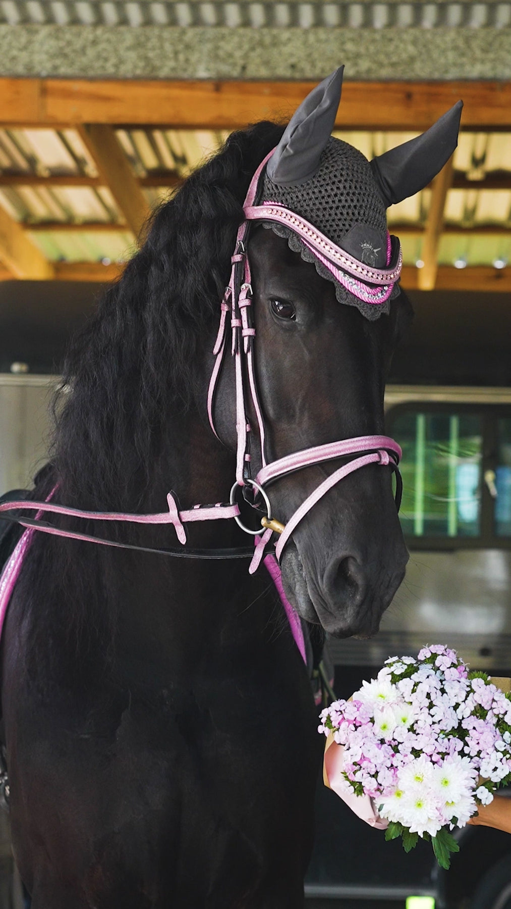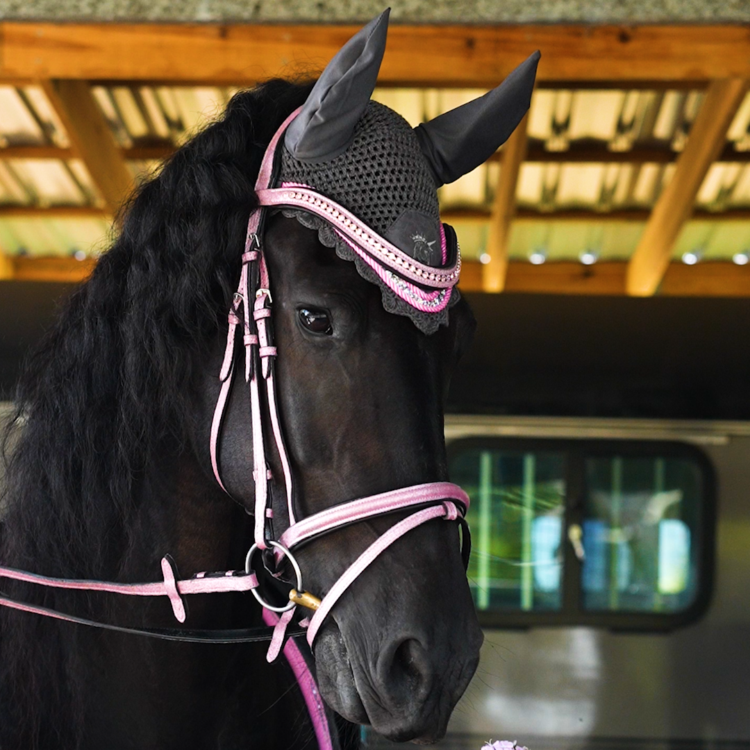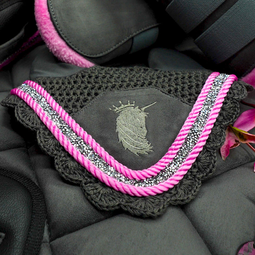 The Petal Smoke Fly Veil features a stunning smoky grey crochet base, beautifully framed with a candy-pink trim for a timeless yet feminine finish and delicately striking.