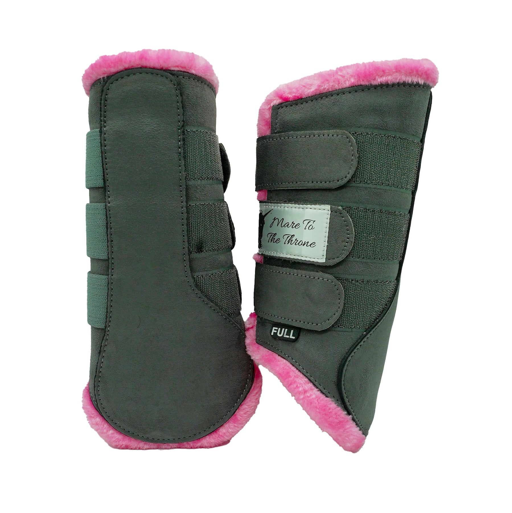 ThePetal Smoke Brushing Boots designed in a luxurious smoky grey suede, these boots offer dependable support while showcasing a beautifully classic candy pink, teddy bear like trim.